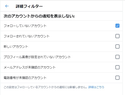 詳細フィルターでは、チェックボックスを入れた項目の通知を表示しないように設定することができます。必要な項目のチェックボックスはオフに、不要な項目のチェックボックスはオンにしましょう。プッシュ通知・SMS通知・メール通知