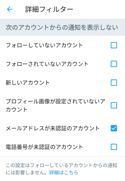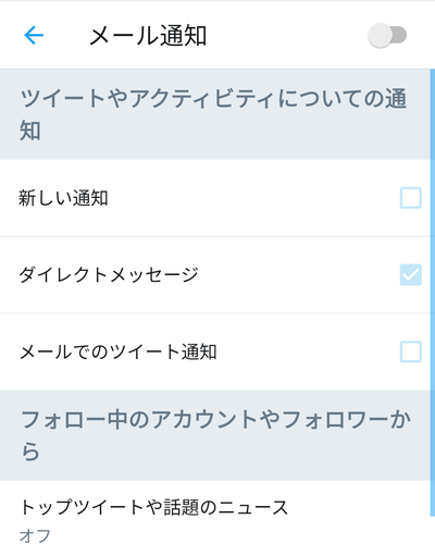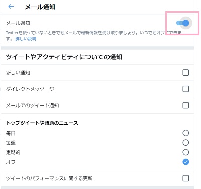 メール通知は、詳細画面でボタンをオンにすることで通知する項目を設定できるようになります。必要な通知のチェックボックス・ボタンをオンにしましょう。Twitterの通知が届かない場合の対処法(スマホ)