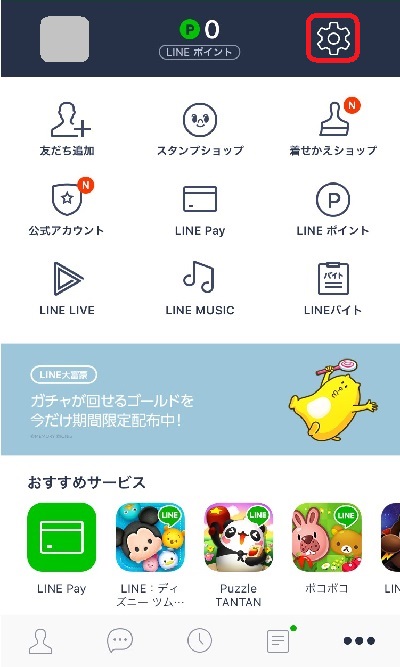 一番右のメニューの右上の歯車マークをタップし設定画面を開きます。