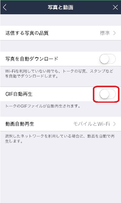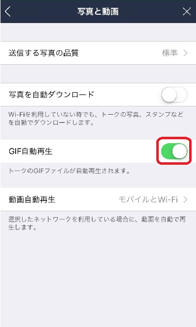 トークに送られたGIFはデフォルト設定では自動的に再生されますが、設定を変えることによってトーク画面上で自動再生されないようにすることができます。