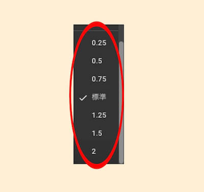 0.25/0.5/0.75/標準/1.25/1.5/2 と7つの速度から選択し、設定できるようになっているので、初めての方は、そのYouTube動画の聴きやすい速度に調整を行ってみて下さい。