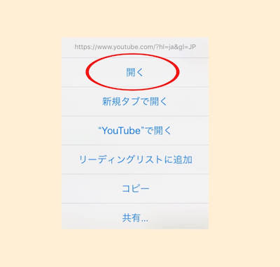 そのままタップをして開いてしまうと、自動でYouTubeアプリが起動してしまうこともあるので、念のため、リンクを「長押し」してから開くを選択して下さい。