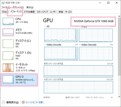 「タスクマネージャー」ウィンドウが表示されるので、「パフォーマンス」タブをクリックします。パフォーマンスの左側メニューから「GPU 0」をクリックするとGPUのグラフが表示されますが、画像では右上に表示されている「NVIDIA GeForce GTX 1060 6GB」が当てはまります。「NVIDIA」がメーカー名で、「GeForce GTX 1060GB 6GB」が型番というわけですね。もしグラボを2枚差している場合は「GPU 0」と「GPU 1」のようにそれぞれ異なる項目で表示されますよ。
