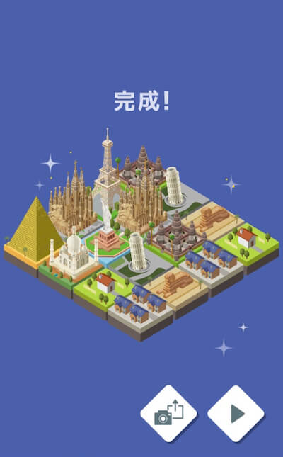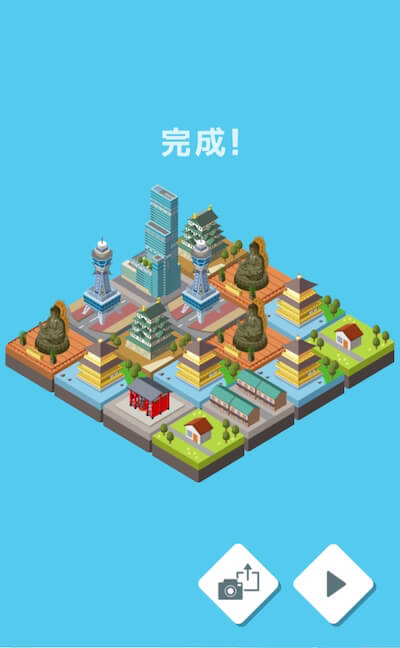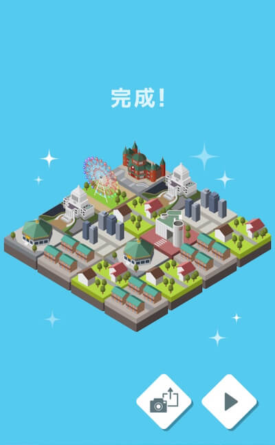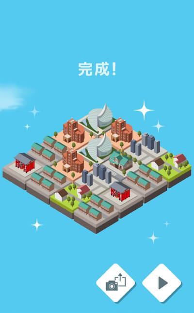 全てのマスに建物が埋まり、動かすことができなくなったらゲームオーバーとなり、最終的なスコアで競います。 完成した街やスコアは、画像として保存したり、SNSで共有することができます。