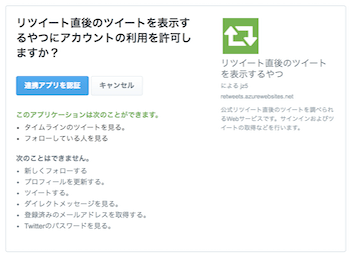 おなじみのTwitterとのアカウント連携を行います。「連携アプリを認証」をクリックして先に進みましょう。