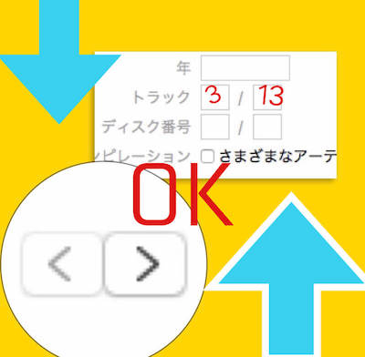 例)トラックという部分ですが、アルバムが13曲入りのものとして想定すると、トラックの分母の枠に13と入力し、編集中の曲が3曲目の場合は、分子の枠に3と入力する必要がありますので、ここだけ気をつけて下さい。