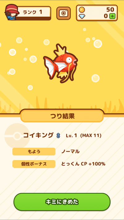 釣ってすぐに「コイキング」のステータスを確認できるようです。 ステータスからわかるのは ・♂か♀か ・もよう ・個性ボーナス です。この内容によってコイキングの能力がわかります。
