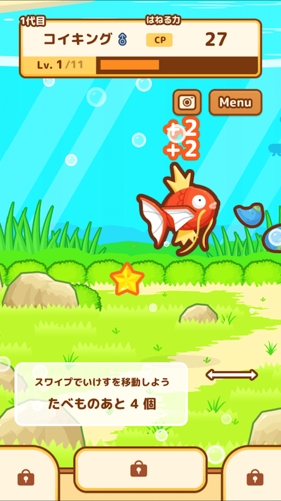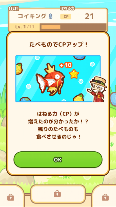 たべものを食べさせると、コイキングのCPがアップします! たくさん食べさせてどんどんCPを上昇させましょう!