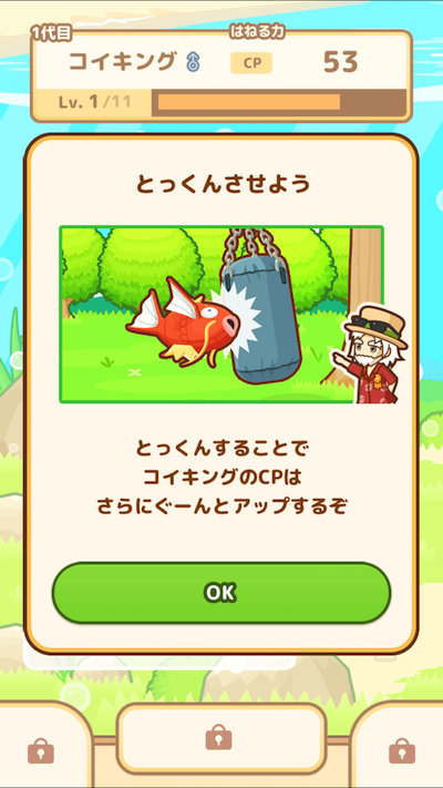 たらふくたべものを与えたら、次は「とっくん」させましょう! とっくんをすることでコイキングはさらなる力を得ることができます!