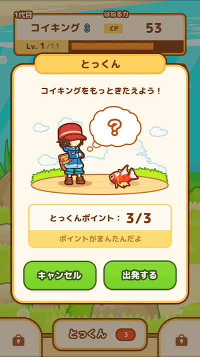 「とっくん」には「とっくんポイント」を使用します! 「出発する」をタップしてとっくんに出発しましょう!