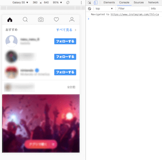 すると、スマホの見た目となり、この状態でインスタグラムのサイト https://www.instagram.com/?hl=ja にアクセスすることでスマホページが表示されます。