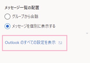Web版Outlookにログインしたら、画面右上の設定ボタンをクリックして設定を開き一番下の「Outlookのすべての設定を表示」をクリックしましょう。