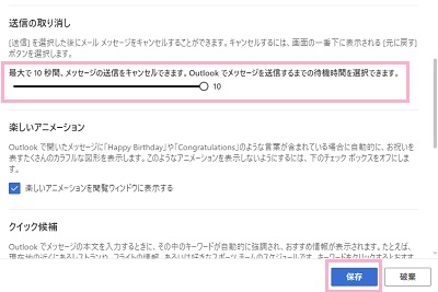 「作成と返信」の設定項目一覧にある「送信の取り消し」のスライドバーから、送信をキャンセルできる時間を設定できます。0~10秒の間で設定してから「保存」をクリックしましょう。あとはメールの送信時に「元に戻す」通知が表示されるようになるので、設定した時間以内にクリックすることで送信をキャンセルできるようになりますよ。