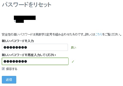 送られてきたメールに記載されているパスワードリセット用のURLを開くと、このような画面になります。 英数字と記号を組み合わせた新しいパスワードを2つある入力フォームに記載して、送信すればパスワードの再登録が完了します。 もし忘れたパスワードを思い出して、パスワードを設定しなおしたい時にも上記の手順でパスワードの変更が可能です。