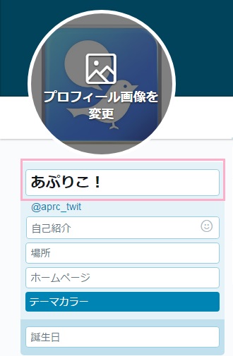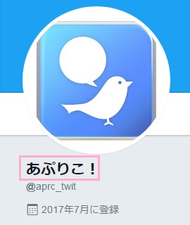 一般的にアカウント名と呼ばれるのがこの部分です。 画像で挙げると、線で囲まれた「あぷりこ!」の部分が名前になります。名前の字数制限は最大20文字までとなっています。