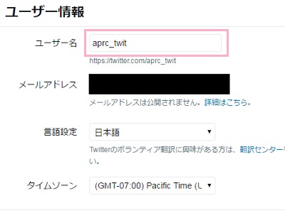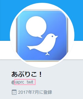 画像の「@aprc_twit」の@の先の部分、つまり「aprc_twit」がスクリーンネームになるわけですね。