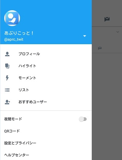 Twitterアプリの自分のユーザーページを開き、ユーザーアイコンをタップするとメニューが表示されます。