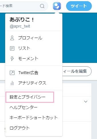 まず、画面の右上にあるユーザーアイコンをクリックするとメニューが表示されるので、メニューの「設定とプライバシー」をクリックします。