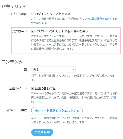 ページの真ん中にある「セキュリティ」項目の「パスワードのリセットに個人情報を使う」のチェックボックスをオンにして、画面下部の「変更を保存」ボタンをクリックします。