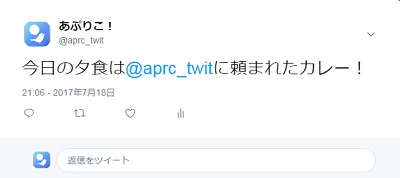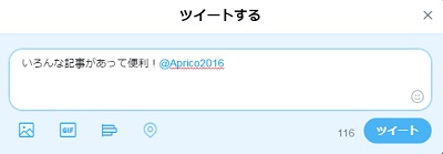 そしてこんな感じに、「@ユーザー名」の前後につぶやきたい事を書いてツイートボタンを押せば、メンションになります。