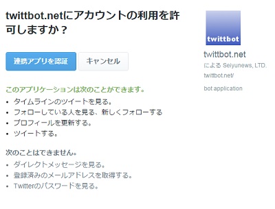 画像認証に成功すれば、今度はTwitterの認証になります。「連携アプリを認証」ボタンをクリックしましょう。これで自身のTwitterとついっとぼっとが連動するようになります。