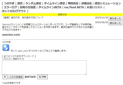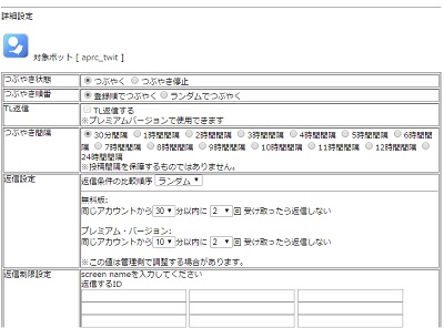 botのつぶやきはただ一定時間ごとにつぶやくだけではなく、指定された日時に特定のつぶやきをつぶやく・特定の単語が入ったリプライに対してリプライを返すなどの詳細な行動も設定できます。