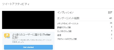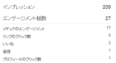 例えばこのツイートは筆者が写真を撮ってアップした時のエンゲージメントを調べたものですが、インプレッションが227に対して投稿のエンゲージメント総数が41と、少しではありますが反応を得られていることが分かります。