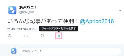 Twitter上でエンゲージメントを知りたい時は、エンゲージメントを知りたいつぶやきの下部にあるボタンの一番右側の「ツイートアクティビティを表示」をクリックしましょう。