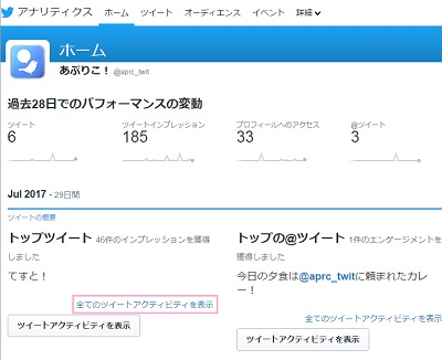 アナリティクスが表示され、直近でのツイートの反応が見れるようになります。画面下部の「全てのツイートアクティビティを表示」をクリックしましょう。