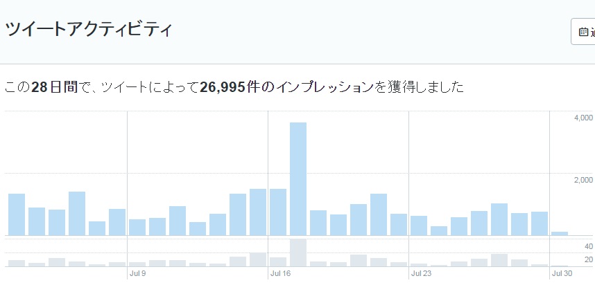 自身の過去28日間のツイートアクティビティを見られるようになります。画面上部にはグラフが配置されており、上の青いグラフがその日の合計インプレッション数、下の灰色のグラフがツイート数です。
