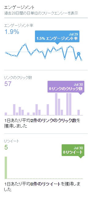 画面の右側では、28日間のエンゲージメント総数がグラフで表示されています。上から順にエンゲージメント率・リンクのクリック数・リツイート・いいね・返信となっています。