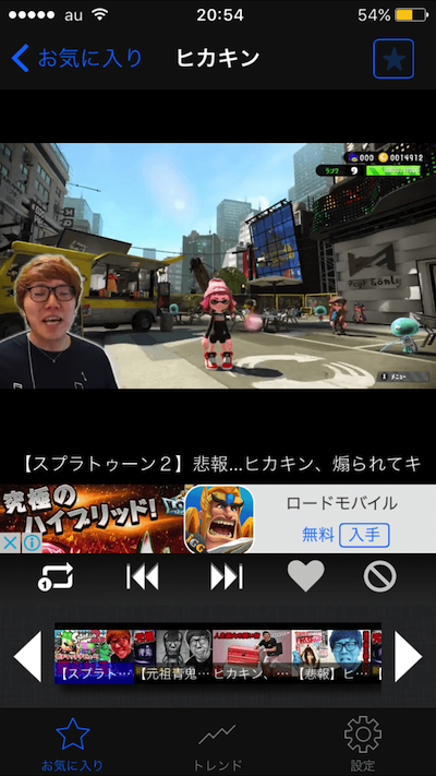 このアプリは、自分の好きな動画を検索して再生したら、このような画面になるので、左下にある「リピートボタン」を押すことで動画を何度も繰り返し再生することができます。