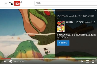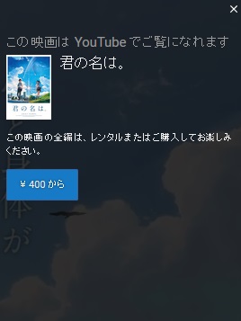例えばこちらの画像は有名アニメ作品の映画版ですが、右側に「300円から」と書かれたメッセージが出ていますね。この映画はYoutubeの映画チャンネル「YouTubeムービー」に登録されている動画です。