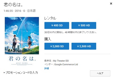 もしGooglePlayカードで動画を購入する場合は、左下にある「プロモーションコードの入力」をクリックしましょう。入力欄が出てくるので、そこにカードのコードを記入すればオーケーです。