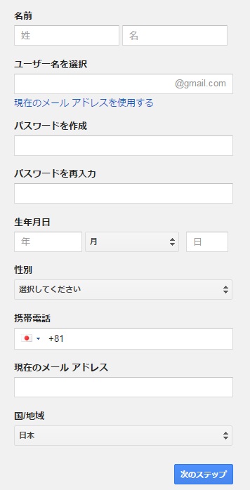 ユーザー名はアカウントと同時に作成されるGmailのアドレスにもなるため、後から変更することはできませんので注意しましょう。携帯電話の番号入力は任意ですが、携帯電話の番号かメールアドレスはアカウント認証のために必要なので必須です。