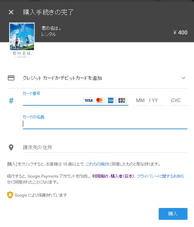 クレジットカード、デビットカード、Paypalで支払う場合は更にウィンドウが開くので、クレジットカードの場合はカード番号と名義、請求先の住所を入力しましょう。