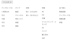 ここで動画を検索したときに「フィルタ」をクリックしてみましょう。すると、検索に対して様々な条件をつけることができます。