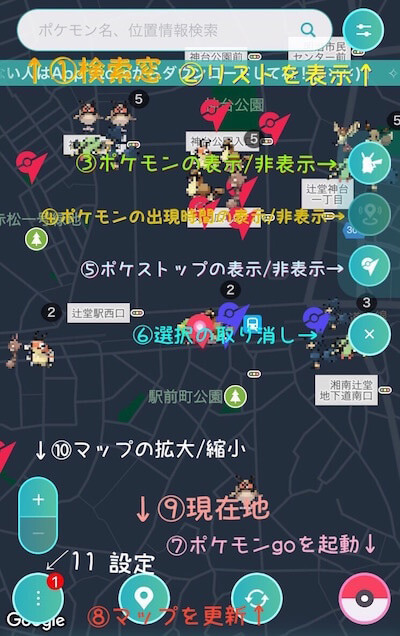 ①検索窓 ②フィルター、リストを表示 ③ポケモンの表示/非表示 ④ポケモンの出現時間の表示/非表示 ⑤ポケストップ/ジムの表示/非表示 ⑥選択の取り消し ⑦ポケモンgoの起動 ⑧マップの更新 ⑨現在地 ⑩マップの拡大/縮小 11 設定 となっています。