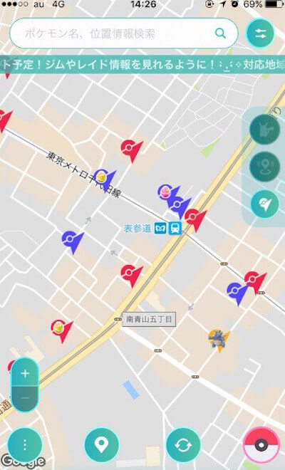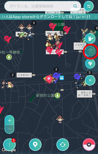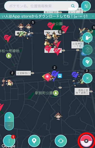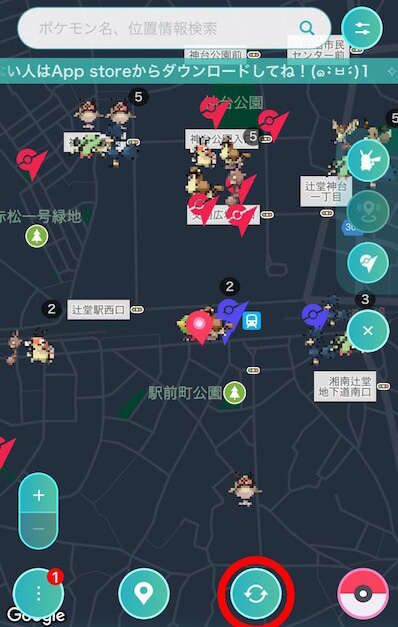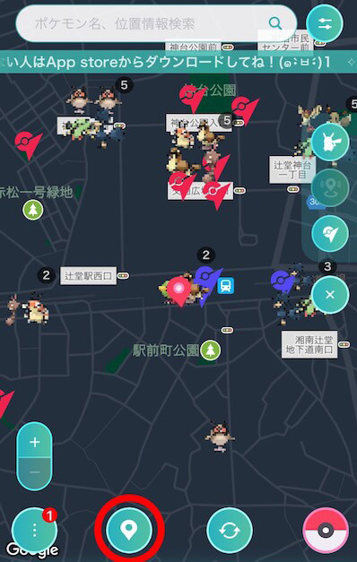 ②ポケモンマークをタップすると、マップ上のポケモンを表示/非表示切り替えることができます。