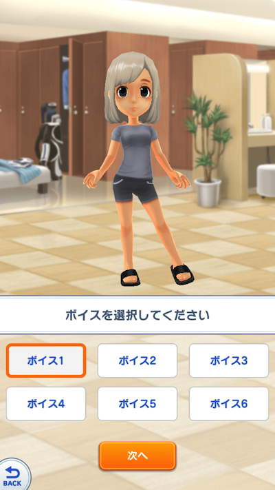 次はボイスを選択します。6種類の声から選ぶことできます。サンプルボイスには「あっ」「みんゴル♡」など特徴がわかりやすいものが多数あります。いろいろ聞いてみて、好みの声を選んでください。