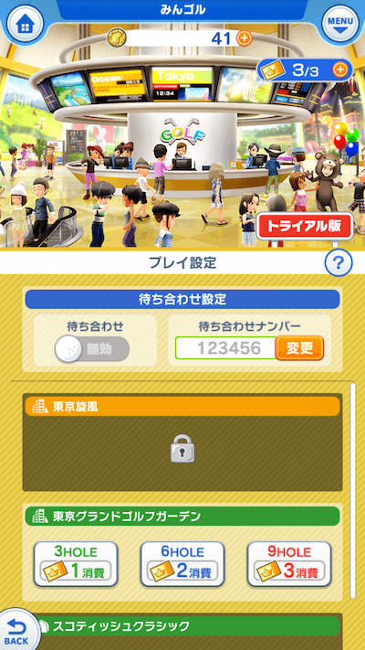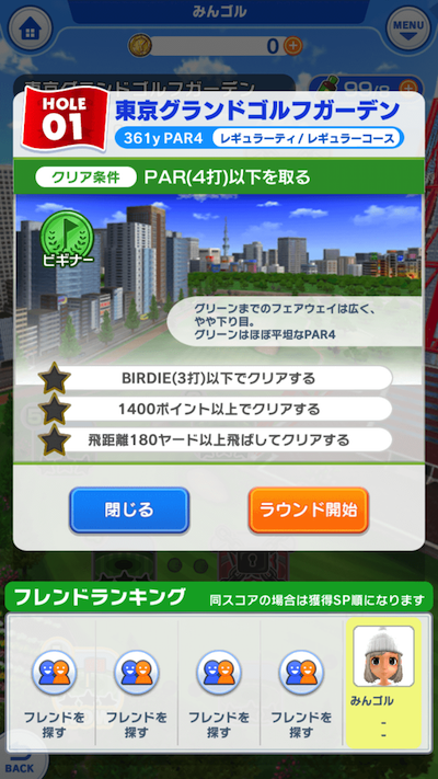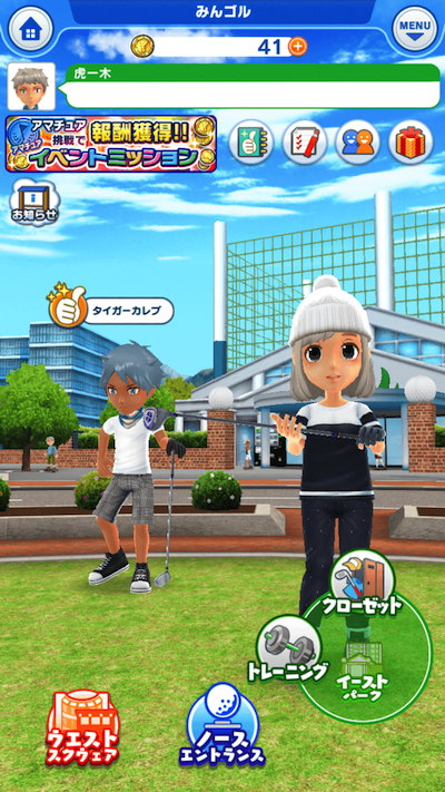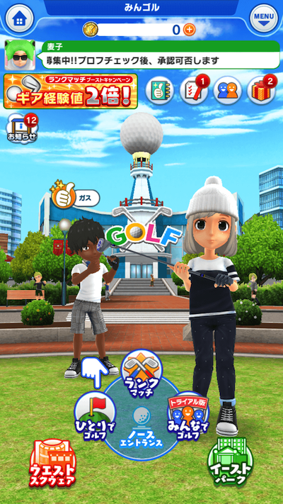 キャラメイクが終わるとメニュー画面「みんゴルシティー」にいきます。