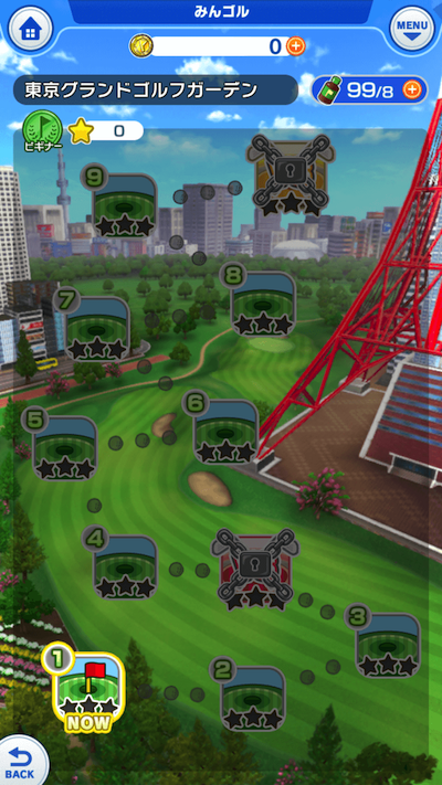 「ひとりでゴルフ」をタップすると「東京グランドゴルフガーデン」に移動します。 このページではいろいろなゴルフのステージに挑戦できます。 早速一つ目のステージに挑戦していきましょう!