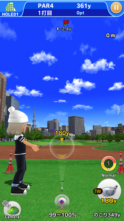 これがプレイ画面です。 ・ホールまでの距離 ・使用しているクラブ ・カメラアングル ・風速 などの要素が表示されています。