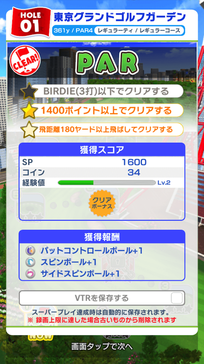 結果はこのような感じになります。 クリアーすると経験値が溜まり、レベルがアップします。 ステージクリアーによってアイテムを獲得ができます。