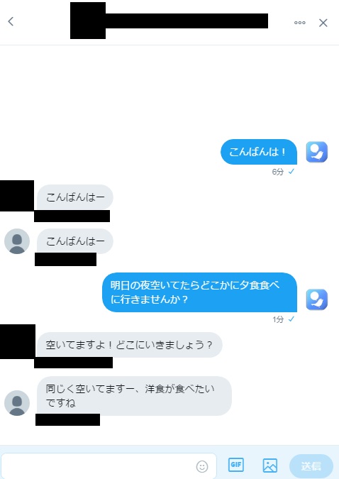 Twitterのグループチャットでのやり取りはこんな感じになります。