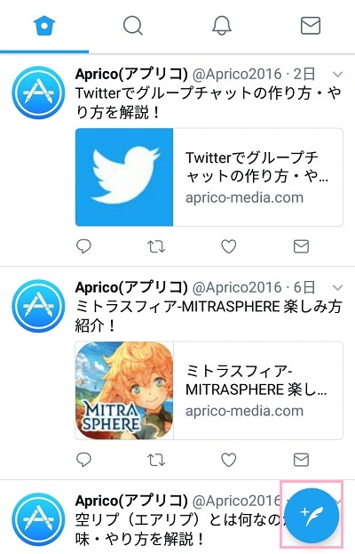 これがツイートボタンです。 このツイートボタンはタイムラインをスクロールして追っている最中、いつでも画面の右下に表示されています。ツイートを投稿したくなったらすぐタップできるので楽ですね。