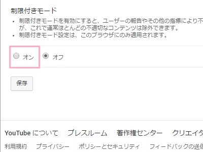 ボタンをクリックするとこのように制限付きモードをオンにするかオフにするか選べるようになるので、オンにチェックをいれ保存をクリックしましょう。