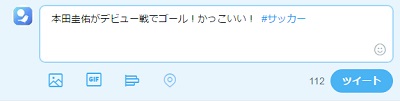 ここでは例としてサッカーについてつぶやくためサッカーと入れます。すると画像のように文字が青くなり、ハッシュタグ化されます。