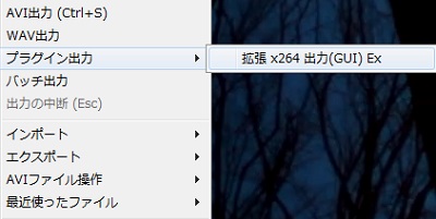次に、同じくファイルメニューから「プラグイン出力」の「拡張x264出力(GUI)Ex」をクリックします。