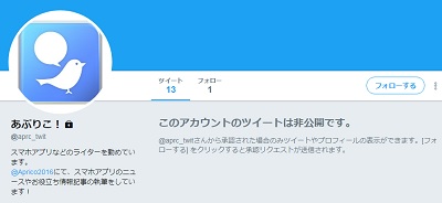 通常であればタイムラインが表示されますが、このように非公開であることをアナウンスした画面になり、ツイートが非表示になります。